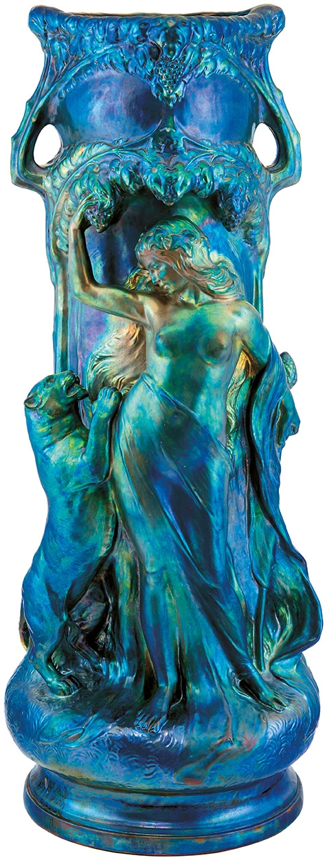 A gyűjtők körében nagy izgalmat kelt egy 1907-1908 táján készült szecessziós remekmű, amelyet Mack Lajos tervezett. A Hölgy párduccal című kerámián figyelemreméltó a kék labrador máz használata, amelynek eredményeképpen a vázán a kék szín legalább harminc árnyalata látható. Az impozáns méretű váza kikiáltási ára 12 millió forint, becsértéke pedig 24-36 millió forint.
