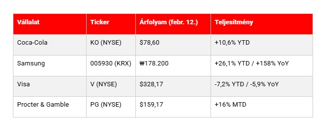 A Procter & Gamble jól szemlélteti, hogy a fogyasztási alapcikkeket gyártó vállalatok részvényei a piaci volatilitás időszakaiban is stabilan teljesíthetnek: 2026 februárjában önmagában 16%-os árfolyam-emelkedést ért el. Ez a teljesítmény éles ellentétben áll a ciklikusabb ágazatokban tapasztalható ingadozásokkal.