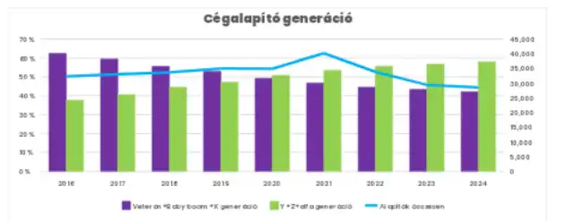 A cégalapítások terén a generációváltás már lezajlott, a fiatalabb nemzedékek aránya tovább nőtt, miközben a vállalkozói kedv összességében mérséklődött. Az Y generáció 2024-ben is a legaktívabb korosztály maradt, az új tulajdonosok 43,7 %-át adva, míg a Z generáció súlya 16 % fölé emelkedett. Az X generáció részesedése 35 % alá, a baby boom nemzedéké pedig 5 % alá csökkent.