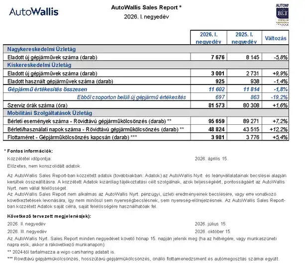 Az AutoWallis Nagykereskedelmi Üzletága 2026 első negyedévében 5,8 százalékkal kevesebb, összesen 7.676 autót értékesített, elsősorban a KGM márka visszaesése (-1.066 darab), másodsorban a Renault és Dacia számainak csökkenése (-517 darab) miatt. Mindhárom márka teljesítményére kedvezőtlenül hatott a kínai márkák által diktált árverseny, melyre a KGM újrapozicionálással reagált, aminek pozitív hatásait a menedzsment a második negyedévtől várja. A Dacia egész Európában tapasztalható visszaesése átmeneti, ami főként logisztikai és gyártási okokra, valamint a modellkínálat átalakulására vezethető vissza. Folytatódott ugyanakkor az Opel teljesítményének javulása (+519 darab) és a tavaly indult romániai Nissan értékesítés is erősödést (+498 darab) mutatott. Mindezen hatások eredményeképpen a Nagykereskedelmi Üzletág előző évhez képesti visszaesése átmenetinek tekinthető, a következő időszakban növekedés várható.