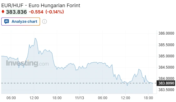 Az euró árfolyama a reggel hét órakor jegyzett 384,58 forintról 383,92 forintra csökkent 18 órakor, napközben 383,68 forint és 384,80 forint között mozgott.