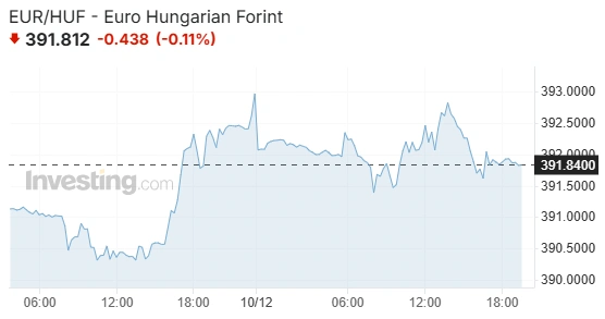 Az euró árfolyama a reggel hét órakor jegyzett 391,94 forintról 391,85 forintra csökkent 18 órakor, napközben 391,33 forint és 393,03 forint között mozgott.