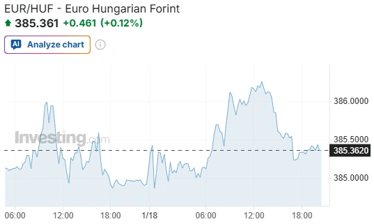 Az euró árfolyama a reggel hét órakor jegyzett 385,35 forintról 385,32 forintra változott 18 órakor, napközben 384,83 forint és 386,33 forint között mozgott.