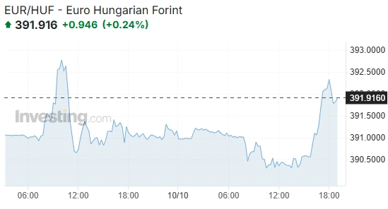 Az euró árfolyama a reggel hét órakor jegyzett 391,04 forintról 392,06 forintra emelkedett 18 órakor, napközben 390,20 forint és 392,35 forint között mozgott.