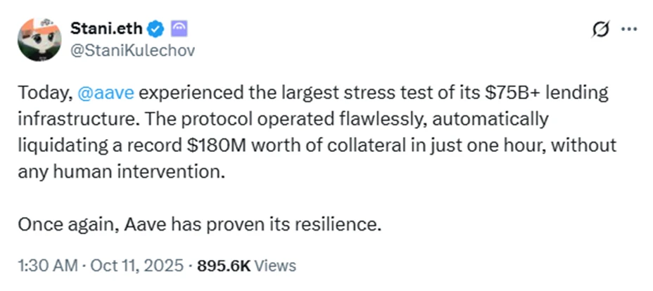 Még a DeFi protokollokat is próbára tette a volatilitás. Az Aave alapítója, Stani Kulechov megerősítette, hogy a hitelprotokoll egy óra alatt rekordösszegű, 180 millió dollár értékű fedezetet likvidált automatikusan, emberi beavatkozás nélkül.