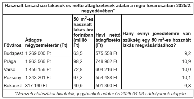 Összehasonlítható módon 2025. második negyedéves adatai állnak rendelkezésre mindenhol, ami alapján Budapesten 63,5 millió forintba kerül egy 50 négyzetméteres használt lakás az átlagos négyzetméterárak alapján. Ugyanezen időszak nettó átlagbéreit is figyelembe véve 9,2 évnyi jövedelmet kell félretenni a lakásvásárláshoz.