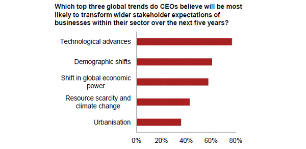 A cégvezetők már felismerték ezeket a változásokat és figyelembe is veszik őket a vállalati stratégiaalkotás során. A 2016-os Globális Vezérigazgató Felmérésünk szerint a cégvezetők 77%-a véli úgy, hogy a technológiai fejlődés az a megatrend, amely a legnagyobb valószínűséggel alakítja majd át az üzleti vállalkozások és partnereik kapcsolatát (lásd az 1. ábrát).