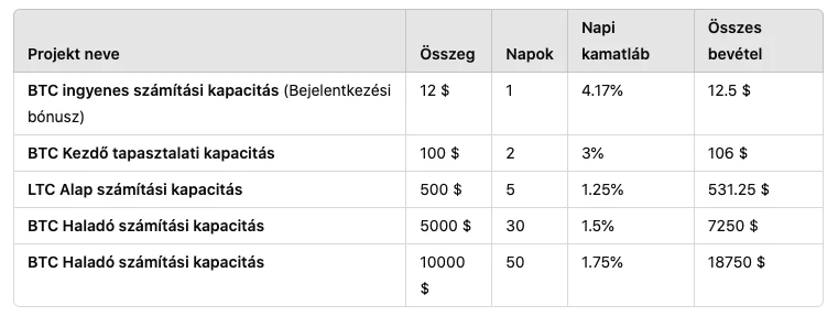 (Különböző szerződések eltérő számítási kapacitással, befektetési összeggel, időtartammal és megtérüléssel rendelkeznek. További szerződésekért látogasd meg a DDB Miner hivatalos weboldalát, vagy kattints a szerződés részleteire.)