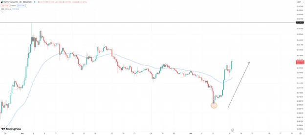 Egy durva esés után a NOT nagy intenzitással pattant vissza, és jelenleg 0,016 dollár környékén kereskedik.