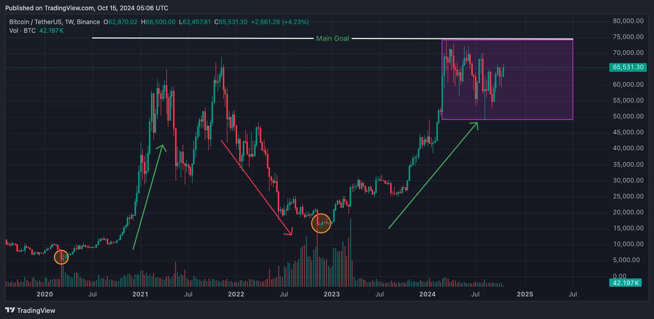 A legutóbbi bikapiac során a Bitcoin elérte a 65 000 dollárt, mielőtt visszaesett volna egy konszolidációs fázisba. Az elemzők úgy vélik, hogy a következő nagy ellenállási szint 65 000 dollár körül van, és ha ezt sikerül áttörni, az jelentős emelkedést indíthat el a Bitcoin árfolyamában 2025 felé.