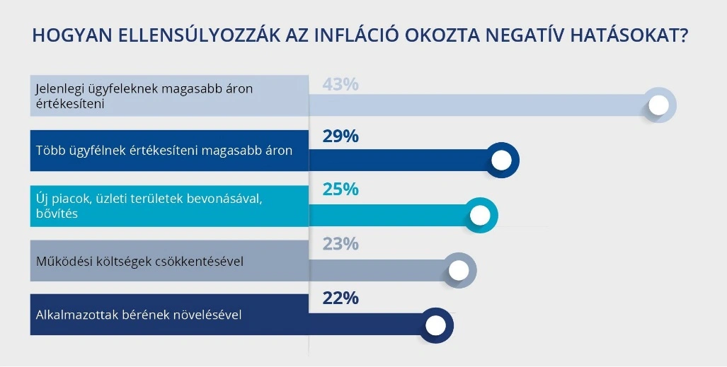 A vállalkozásoknak az energiaárak és az alapanyagárak emelkedése, valamint a gazdasági környezet jelentik a legnagyobb dilemmát jelenleg. A válaszadók többségének jelentősen megnehezíti működését az inflációs nyomás. 43 százalékuk a jelenlegi ügyfélkörnek, 29 százalékuk pedig a több ügyfélnek magasabb áron való értékesítésben látja a megoldást.
