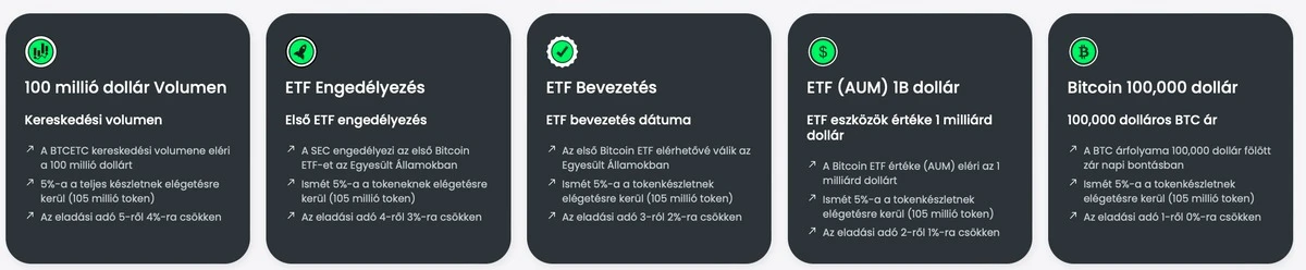 Ez a gyakorlatban azt jelenti, hogy a tokenomikát és a kereskedési adót érintő változásokat a készítők különböző sarokkövekhez kötötték. Ezeknek átlépésével folyamatosan csökkenni fog az elérhető BTCETF száma, illetve a tranzakciós díj mértéke.